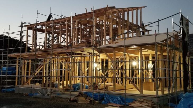 週末上棟のお宅。建物の規模が大きくて、棟まではあげました!!ちょっとライトアップされてていい感じ🎵 #上棟 #棟上げ #ライトアップ #構造 #柱土台 #工務店 #静岡市 #アトリエサクラ