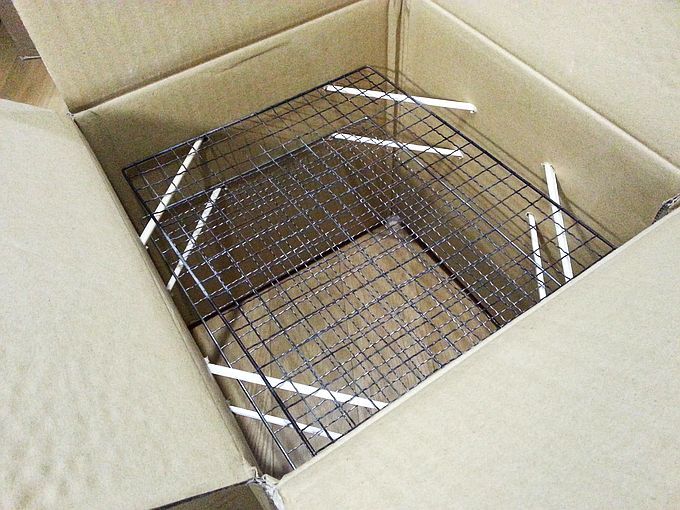 ①ダンボール箱の4つ角に割り箸を差し込んで段ボール燻製器を作る