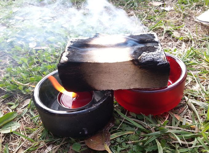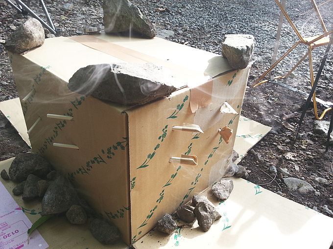 ⑤段ボール燻製器を上からかぶせて燻製の開始!