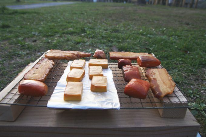 現地で、食材の水分が飛ぶまで乾してから燻製器に入れるようにします。