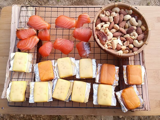 ②お好みの食材を網に乗せて燻製器に入れる (チーズ、サーモン、ベーコン、ナッツなどがおすすめ)