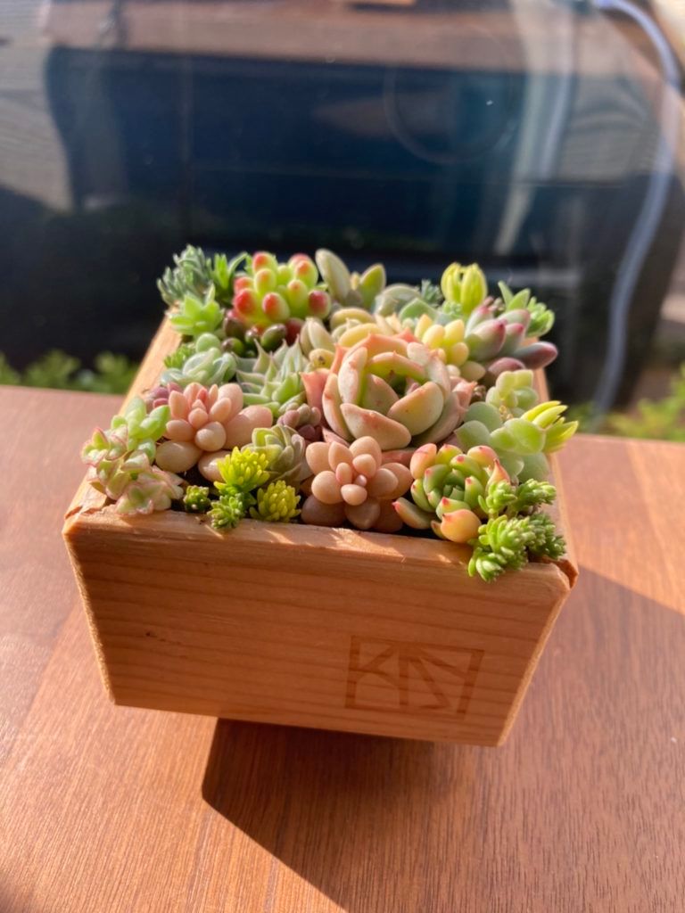私:今日は、以前アトリエ用にと寄せ植えていただいた多肉君も持ってきました!