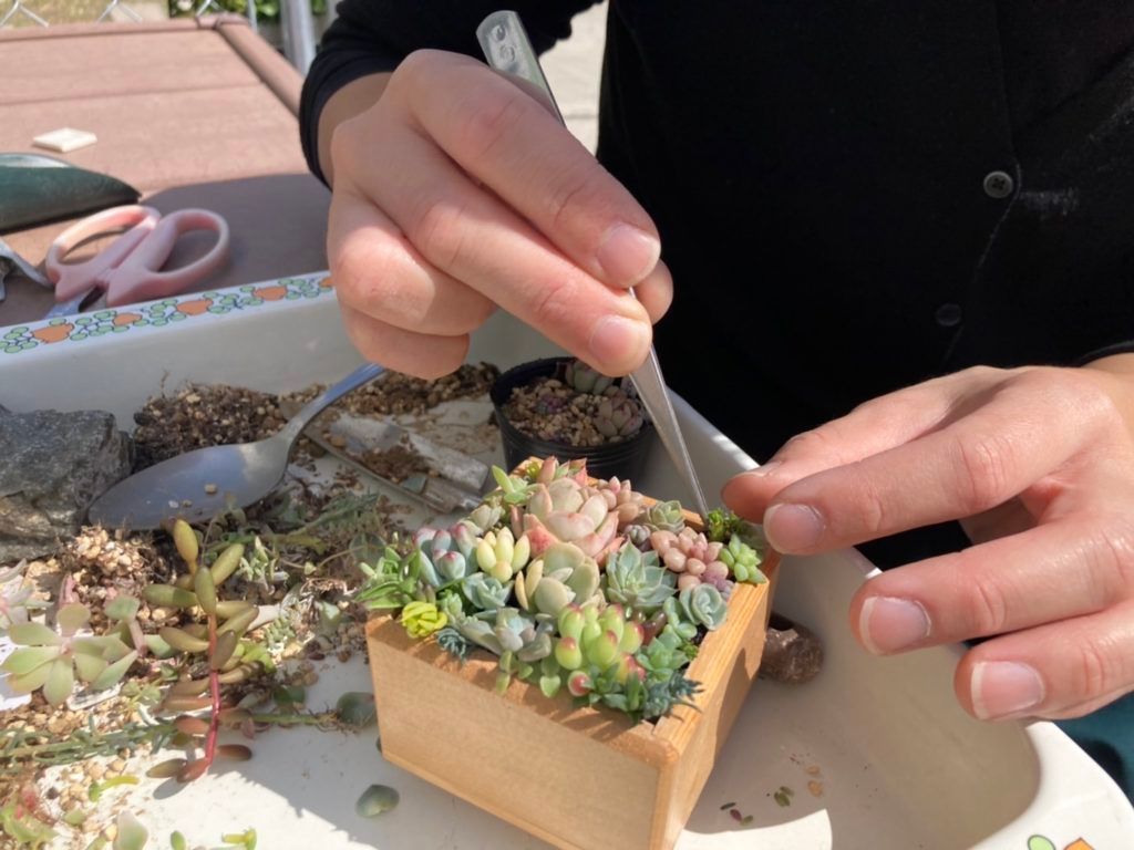 Y様:寄せ植えの場合、土がカラカラの状態だと挿しにくいので、土を入れたら水で湿らせると安定しやすくなります。