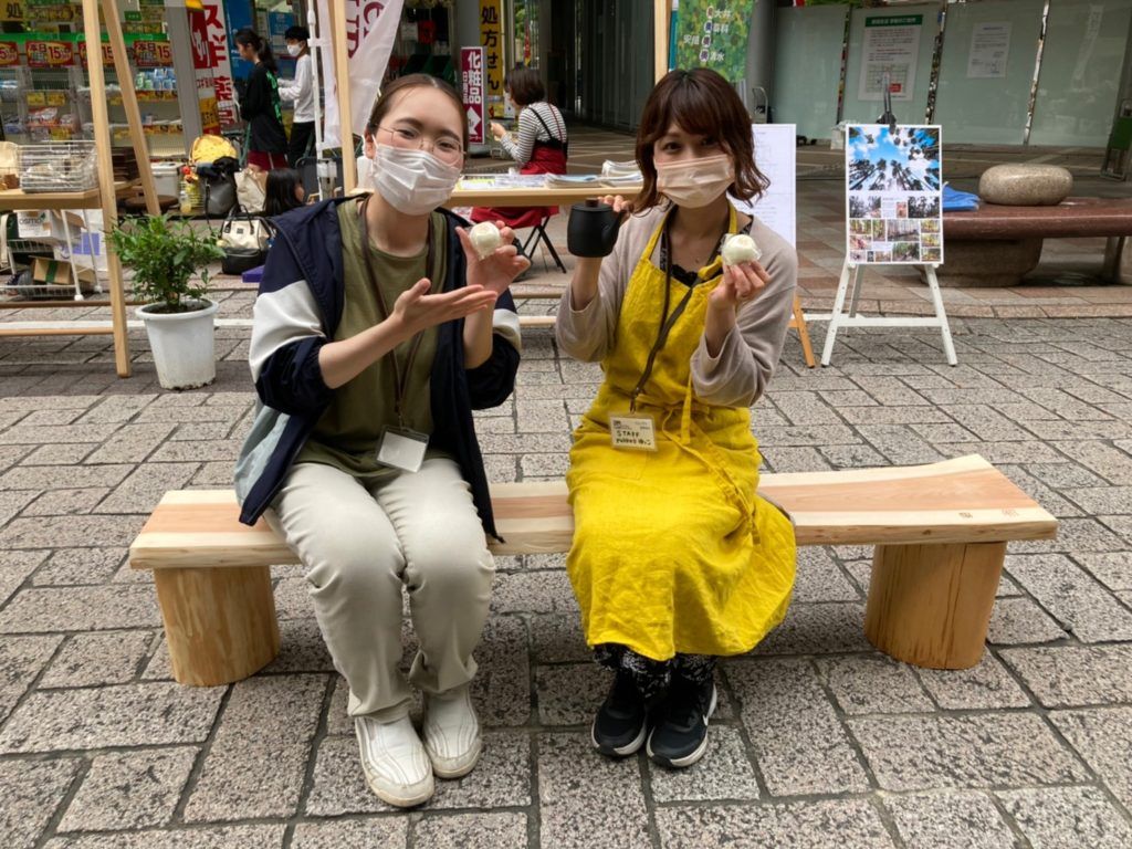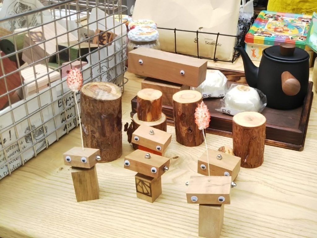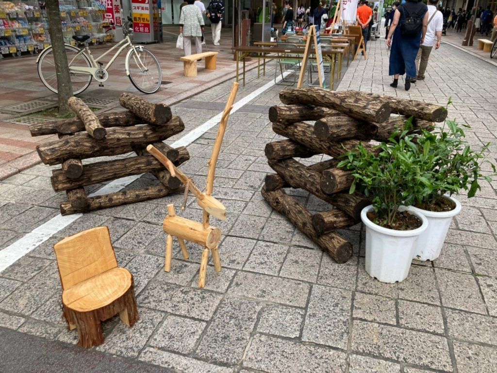 内容:木育ワークショップ、オクシズ材のベンチで一休み、椎茸の原木展示